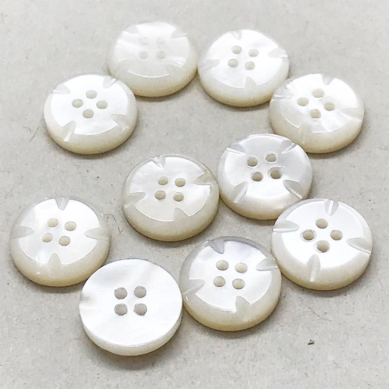 アンティークボタンをイメージした繊細な手彫りが特徴的な4つ穴のシャツボタンです。シンプルな彫りで十字架をデザインしています。白蝶貝と黒蝶貝を使用した高級感ある光沢が特徴です。シャツのボタンを付け替えてお楽しみください。各色10個セットでの販売となります。針穴が小さいので、細めの針をご利用ください。オリジナルシートに縫い付けた状態でお送りいたします。