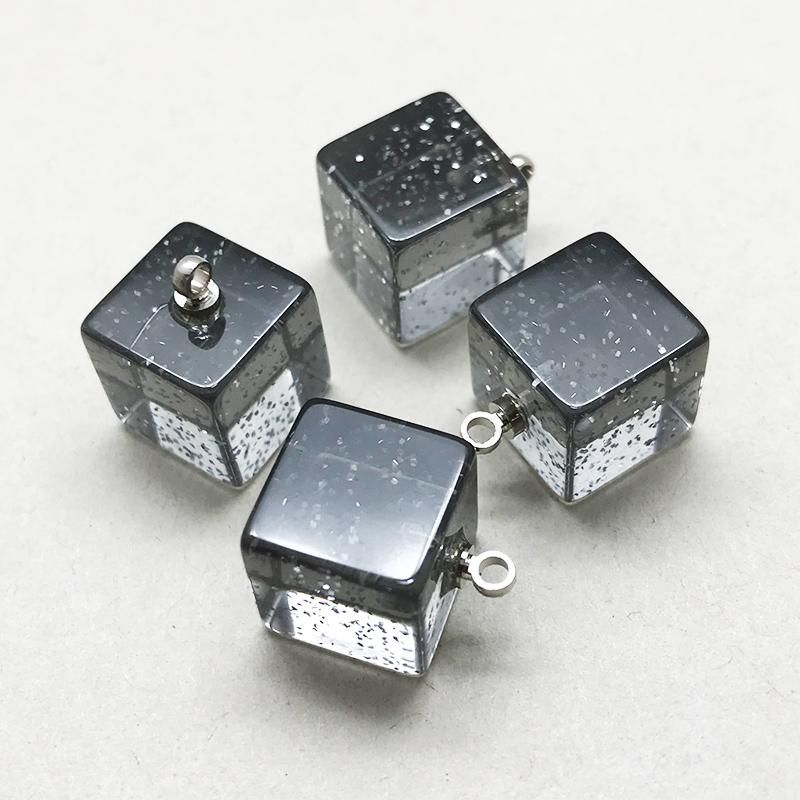 クリアのアクリル素材の中にラメを入れた見た目が晴れやかな立方体のボタンです。アクセサリーのパーツとして、また当店のオリジナルリングやピアス、ねじ式キルトピンに付け替えて楽しめます。