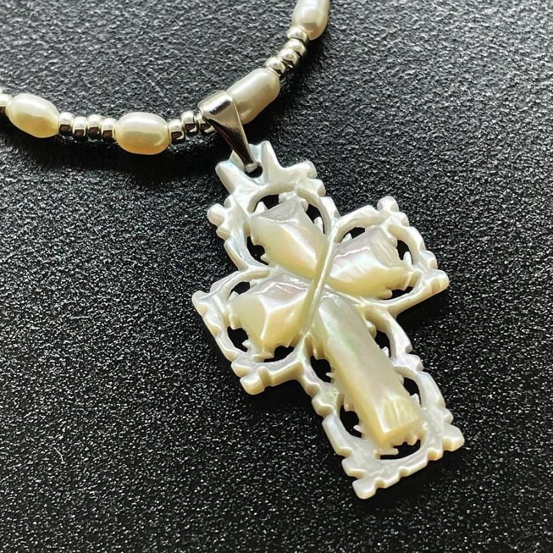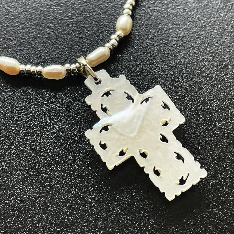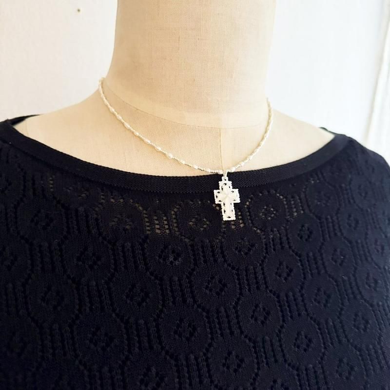 シンプルな小さな十字架のネックレスです。小粒の淡水パールとビーズをミックスしたネックレスは日本製で、クロス用に製作いたしました。長さは38cm+5cmのアジャスター付きです。クロスだけでの販売はしておりません。
