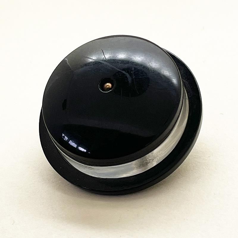 こちらはクリアプラスチックのディスクを黒のカゼインディスクで挟んだクールな印象のボタンです。