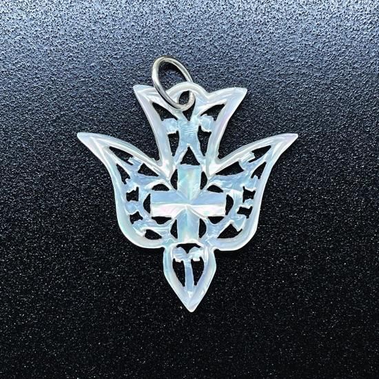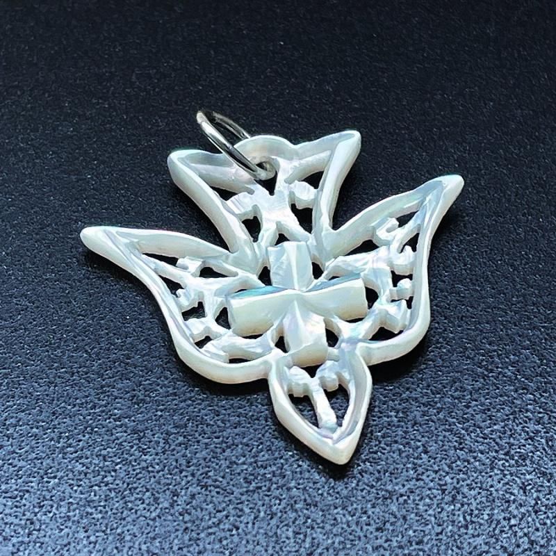 鳥の形の中にクロスのデザインをあしらったキュートなベツレヘムパールのペンダントトップです。シルバーのカンはロウ付けされています。ネックレスは別売りとなりますので、ご注意ください。