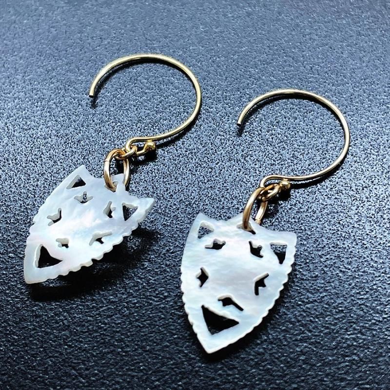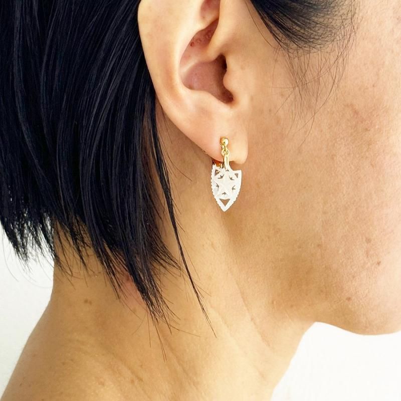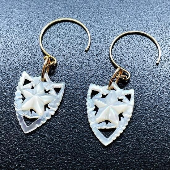 小さなエンブレムの中に七芒星を施したシンプルなベツレヘムパールの耳飾りです。形状は「イヤリング 」、「ピアス」の2種類ございます。