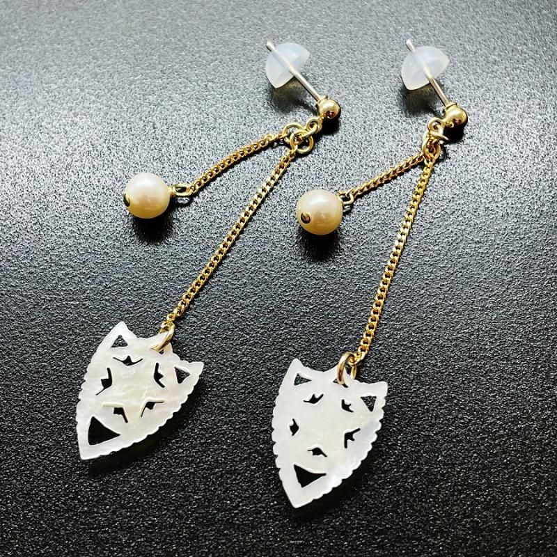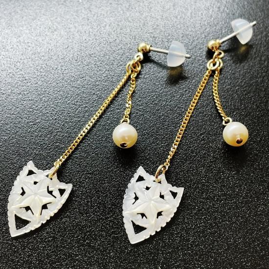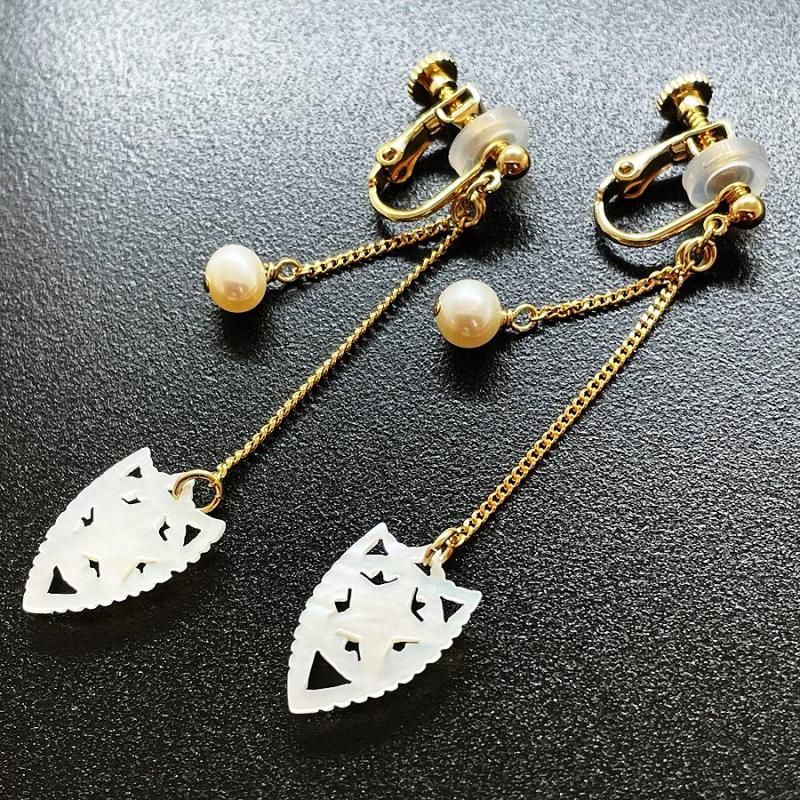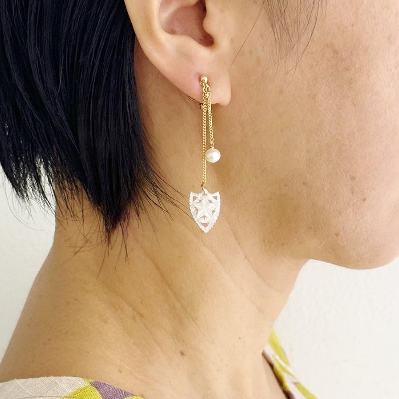 【素材】マザーオブパール(白蝶貝)、淡水パール、イヤリング:真鍮(ねじバネ式)、ピアス:サージカルステンレス(ポスト) シリコン(キャッチ) *その他金具に真鍮を使用しています