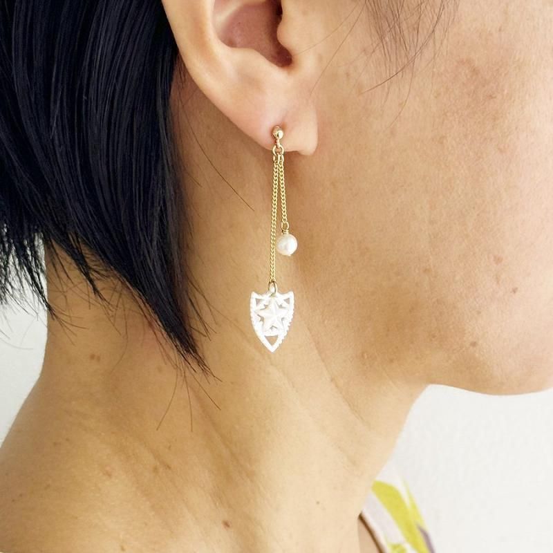 小さなエンブレムの中に五芒星を施したシンプルなベツレヘムパールの耳飾りです。星のエンブレムと淡水パールが耳元で軽やかに揺れる耳飾り。形状は「イヤリング 」、「ピアス」の2種類ございます。