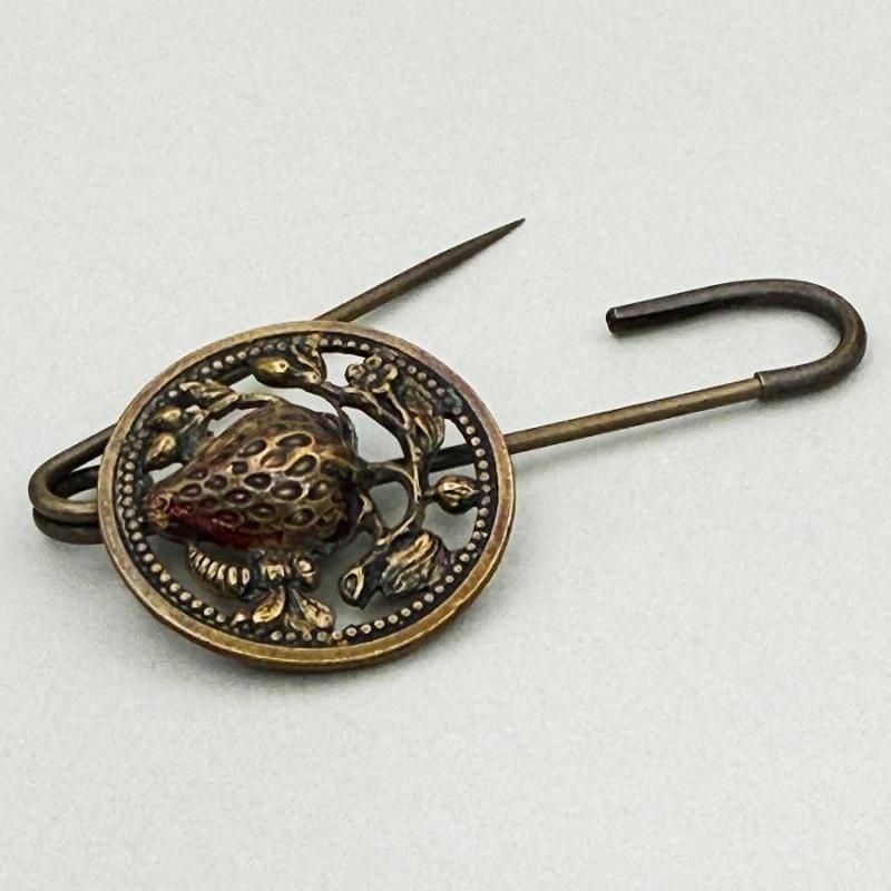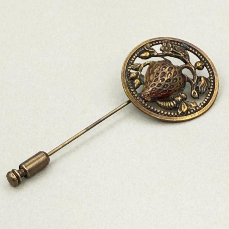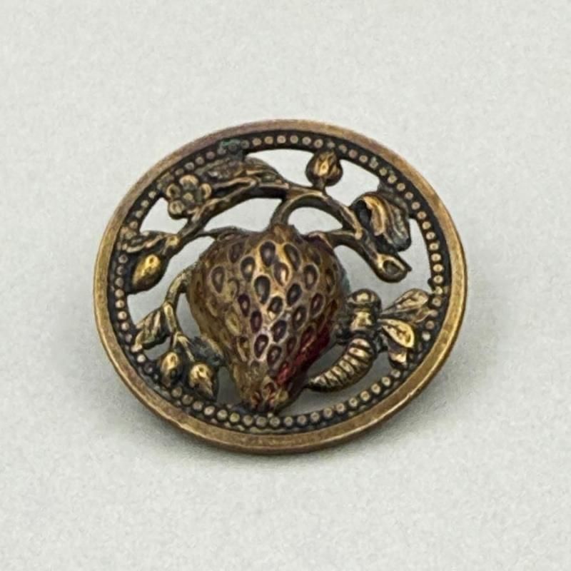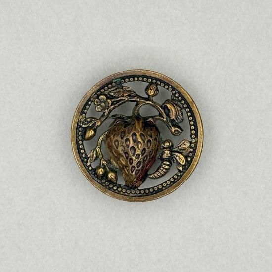 こちらのボタンは苺をモチーフとした透かしのメタルボタンです。元々、苺にペイントされていた形跡があります。フルーツモチーフは、どんな素材も可愛いですね。
