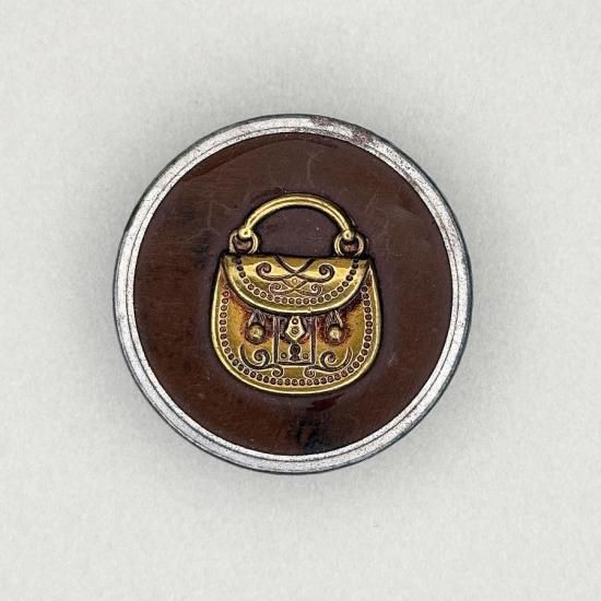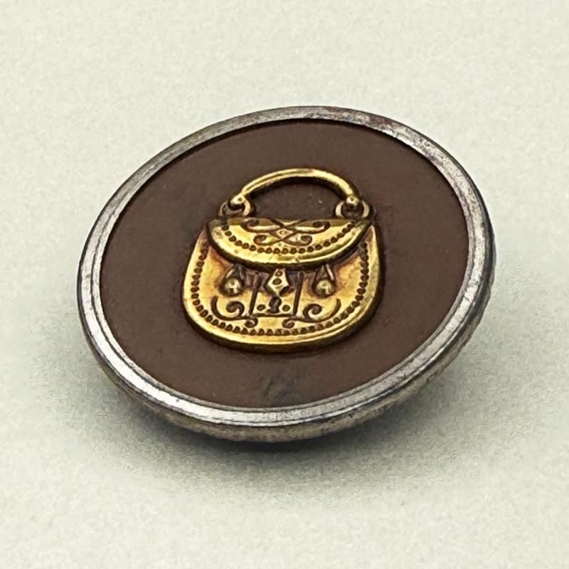 こちらのボタンはバッグをモチーフとしたシンプルなデザインのメタルボタンです。バッグのピクチャーボタンは、今まで見たことがなく、珍しいです。