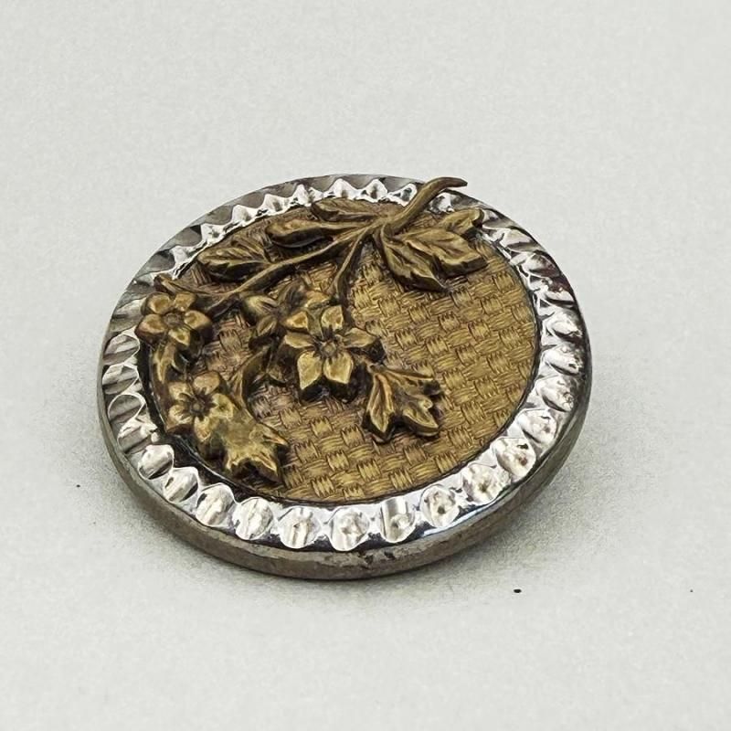こちらのボタンは縁部分の装飾、立体的な草花が素敵な絵柄のメタルボタンです。