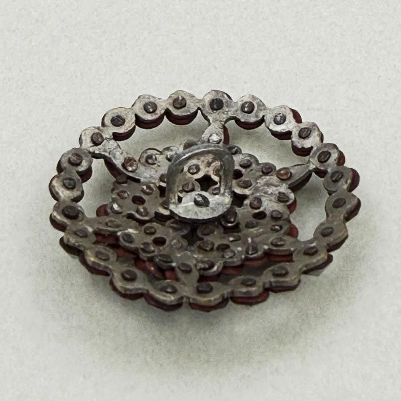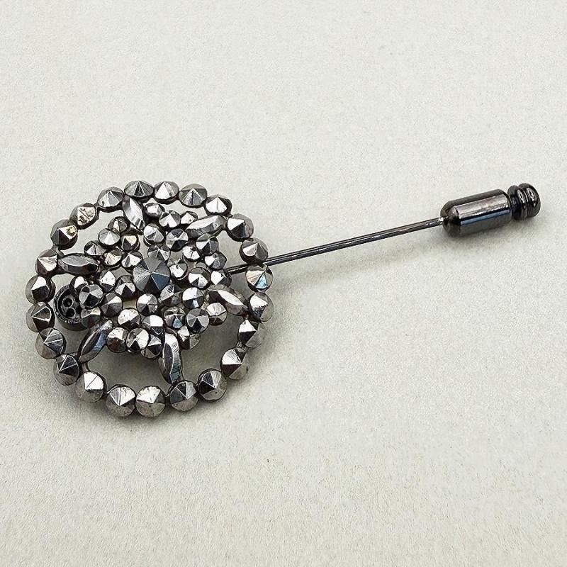 カットスチールとは、ダイヤのような多面カットを施した小さなスチールのパーツの事です。18世紀にイギリスで発明され、貝やエナメルなどの高級素材の装飾にも使われていました。19世紀の終わり頃まで、職人の手により一粒一粒、丁寧に打ち留めて作られていました。