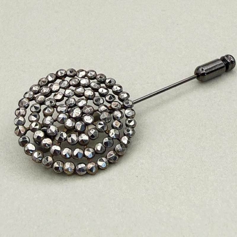 カットスチールとは、ダイヤのような多面カットを施した小さなスチールのパーツの事です。18世紀にイギリスで発明され、貝やエナメルなどの高級素材の装飾にも使われていました。19世紀の終わり頃まで、職人の手により一粒一粒、丁寧に打ち留めて作られていました。