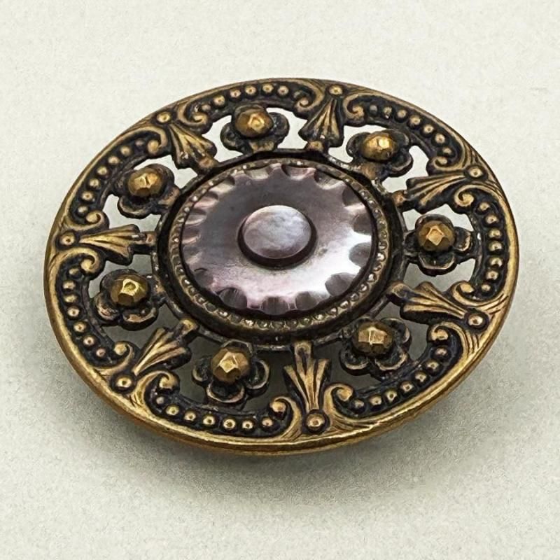 こちらのボタンは中心部分に黒蝶貝が施され、縁の透かしが美しいアンティークボタンです。
