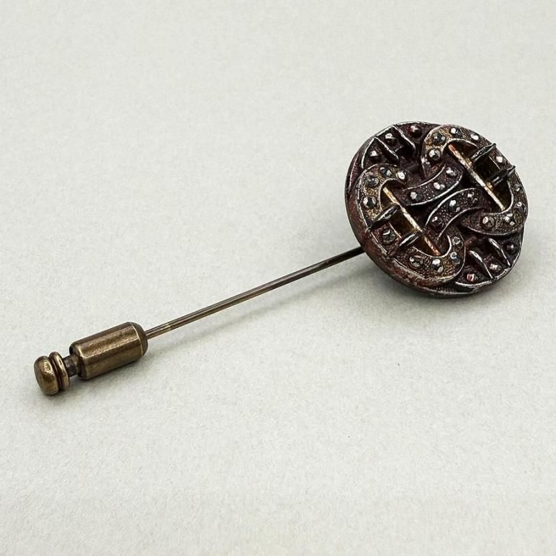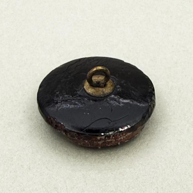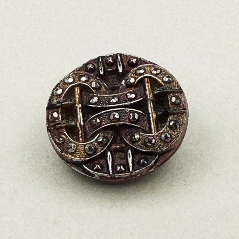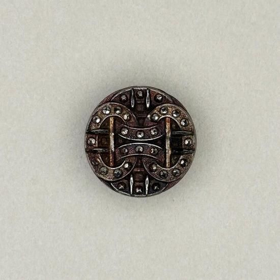 こちらのボタンは、メタルのように見えますが、黒ガラス製です。印象的なバックルのデザインです。カットスチールのように見える部分もガラスで出来ています。2センチと大きなサイズではありませんが、アンティークならではの大きな存在感を感じます。