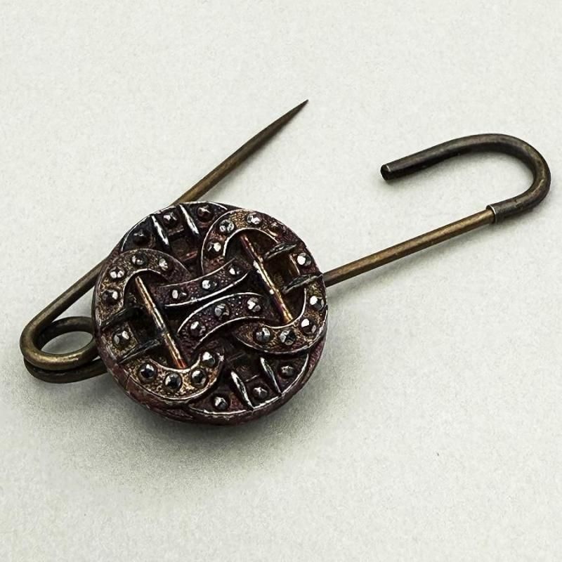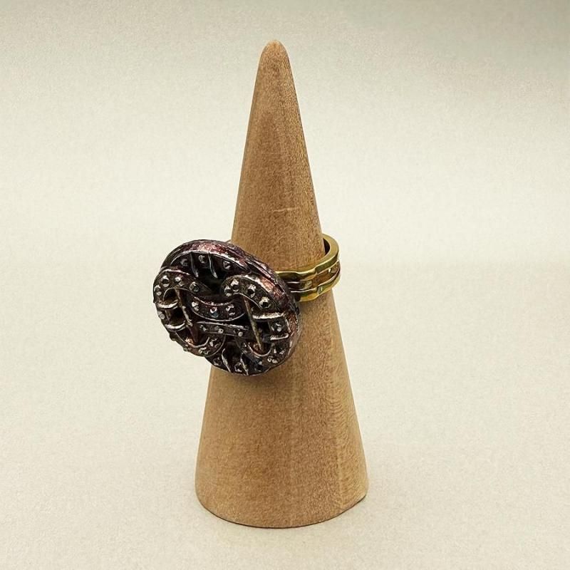 こちらのボタンは裏足が金具のため、リング、キルトピンやボタンピンに取り付けが可能です。