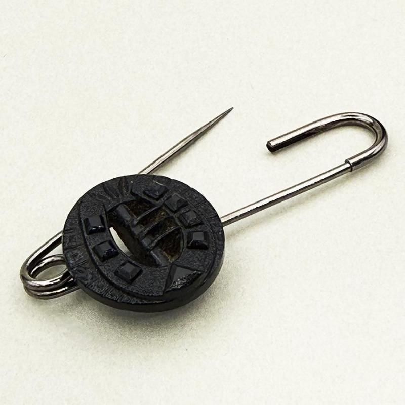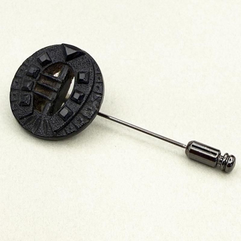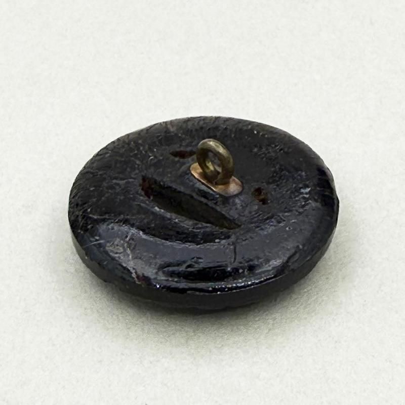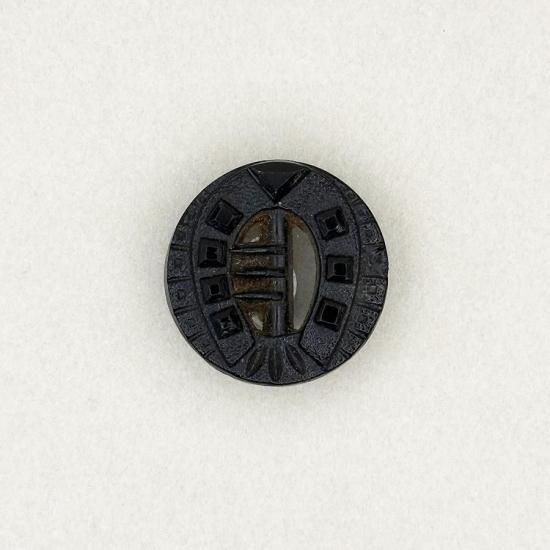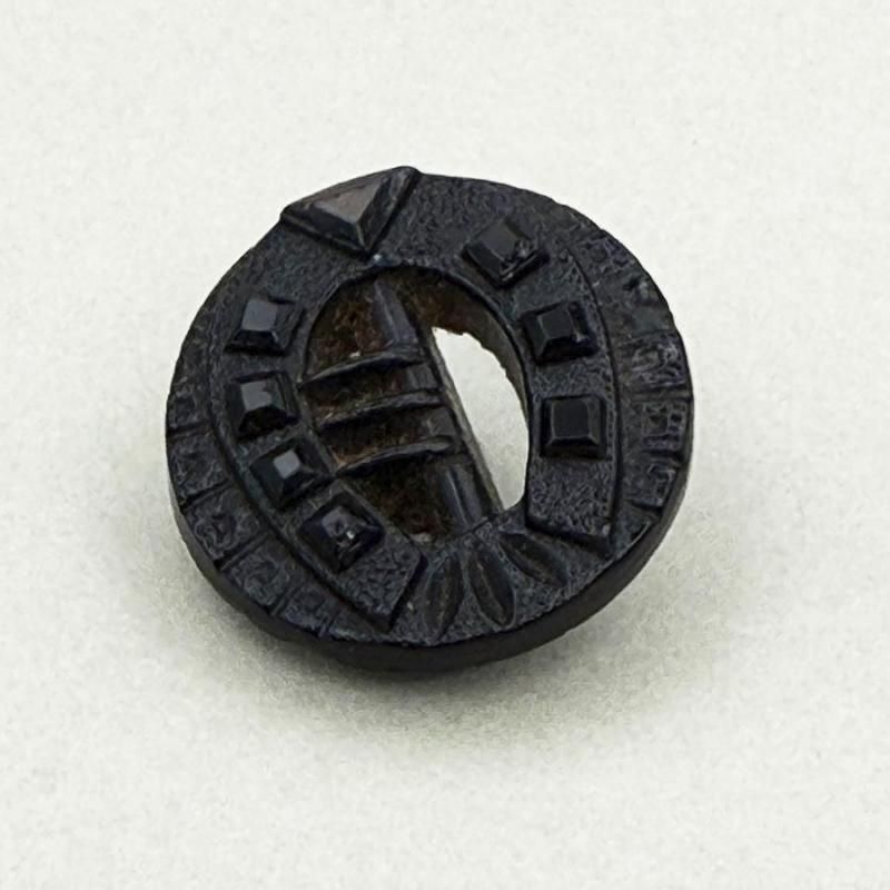 こちらのボタンは蹄鉄型のバックルをモチーフにデザインされた黒ガラスのアンティークボタンです。