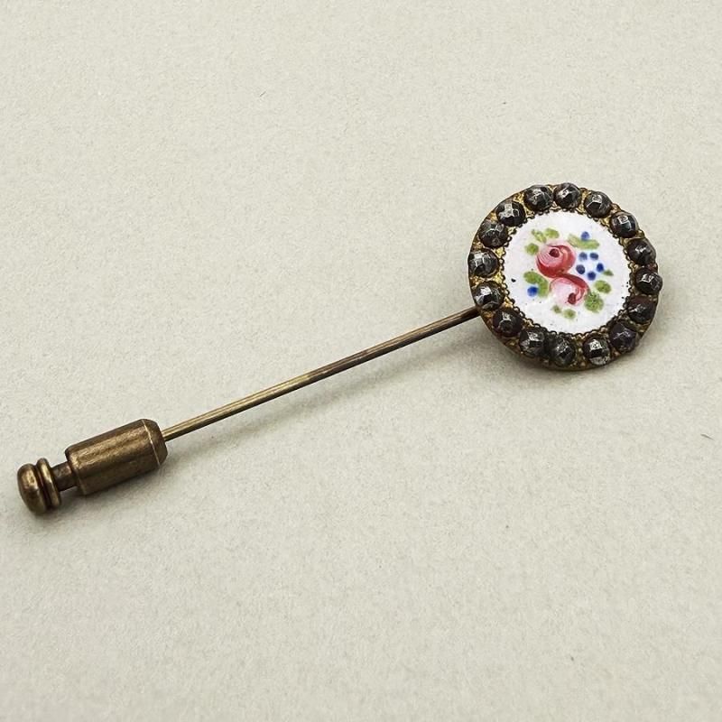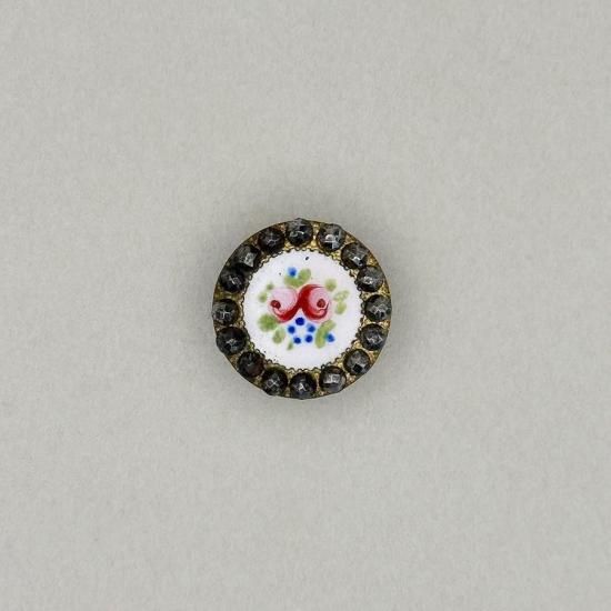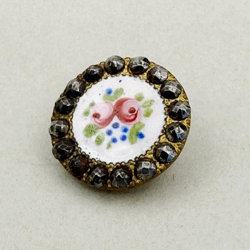 こちらのボタンは、お花の絵が描かれたエナメルのアンティークボタンです。カットスチールの装飾が施されています。