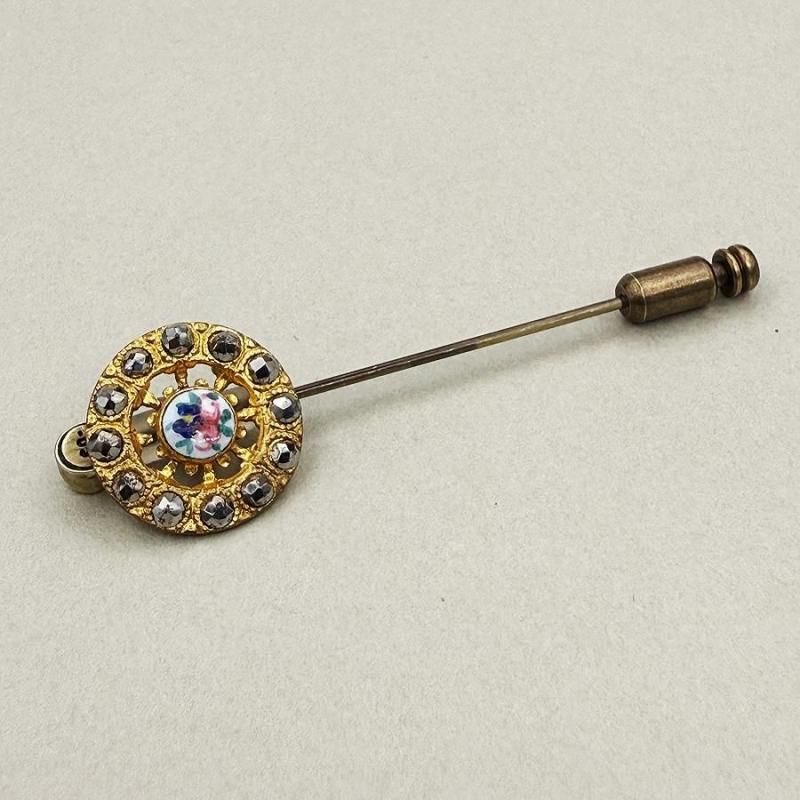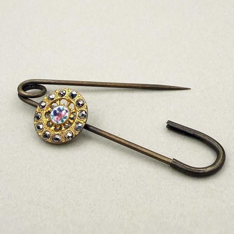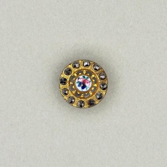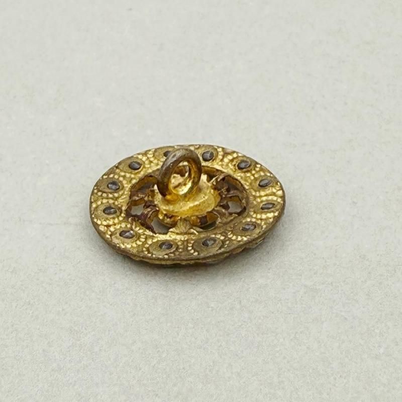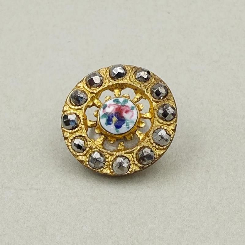 こちらのボタンは、お花の絵が描かれたエナメルのアンティークボタンです。カットスチールの装飾が施されています。