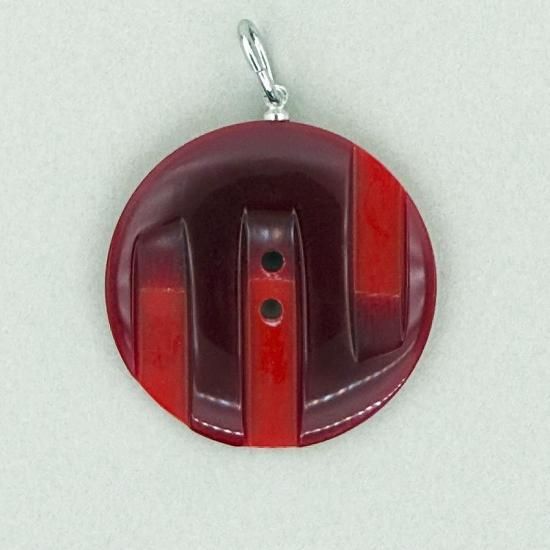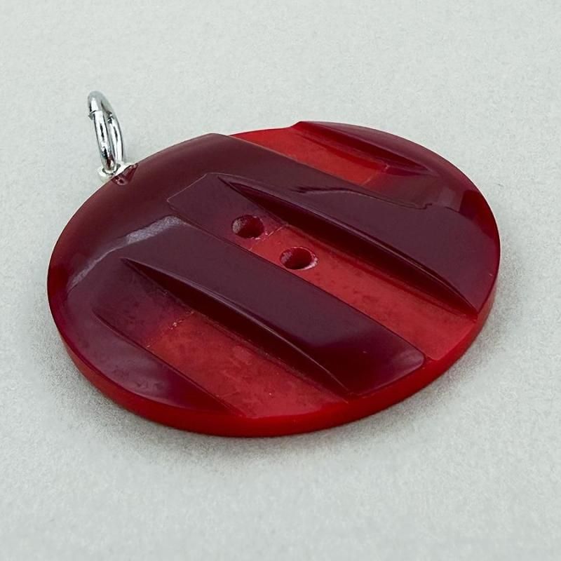 こちらのボタンは2色の赤を直線のカットでデザインされたカゼインボタンです。