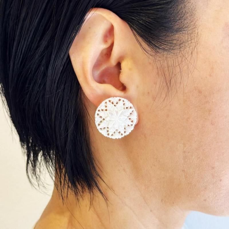 デザインの要となる透し模様は、パールの母貝となる白蝶貝をカットし、小さく開けた穴に糸鋸を通して、手作業で丁寧に加工して行きます。これらは、全て、職人のフリーハンドで行うため、高い技術と経験が必要です。