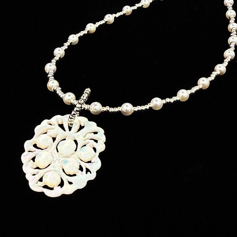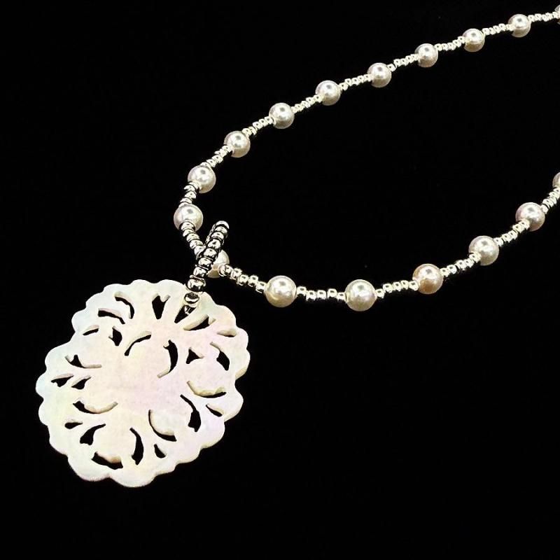 デザインの要となる透し模様は、パールの母貝となる白蝶貝をカットし、小さく開けた穴に糸鋸を通して、手作業で丁寧に加工して行きます。これらは、全て、職人のフリーハンドで行うため、高い技術と経験が必要です。