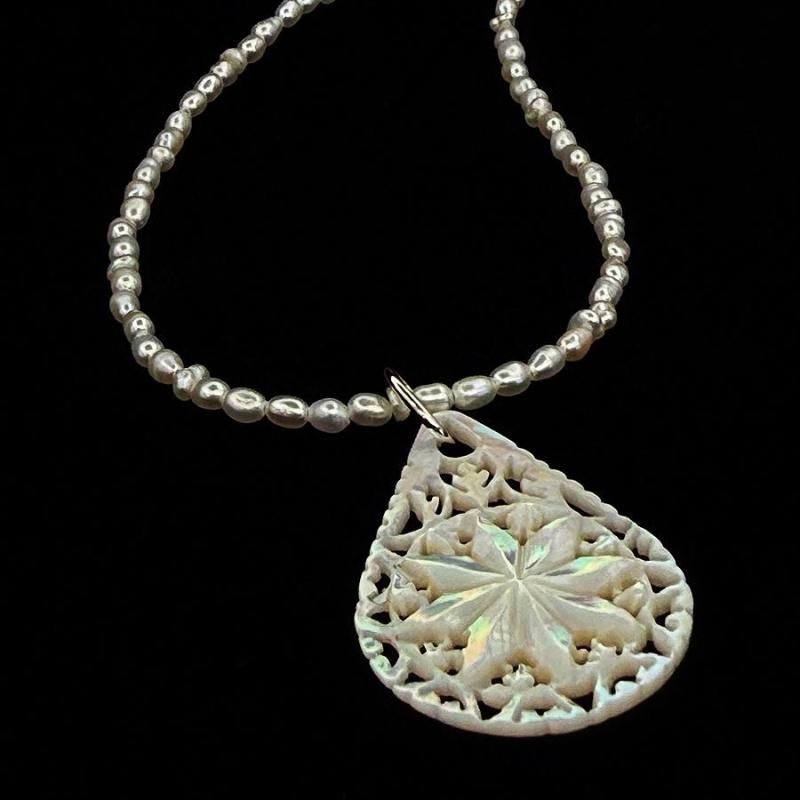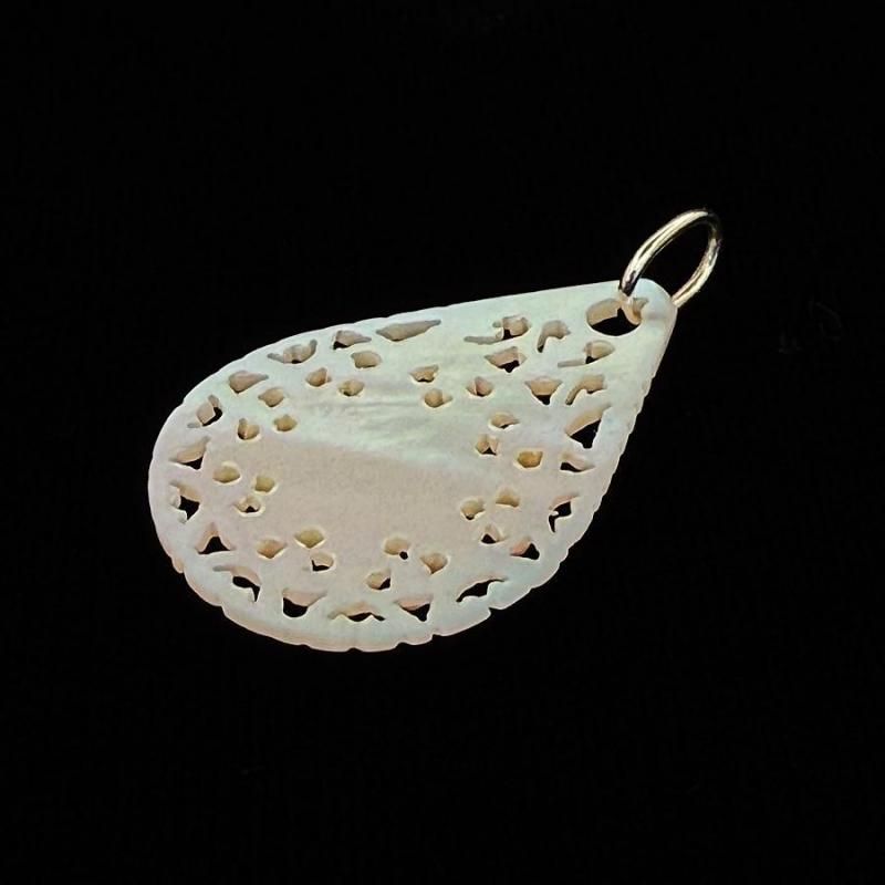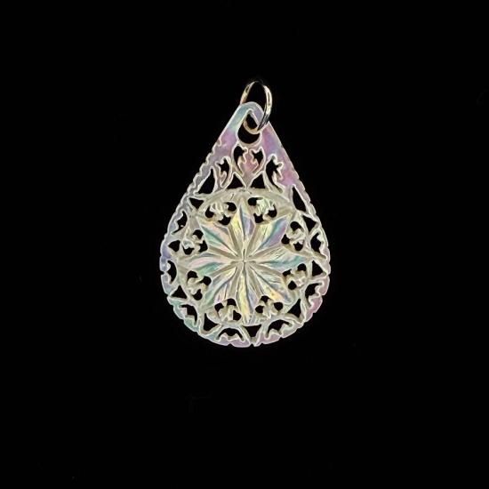涙型のデザインの中に八芒星が彫られた人気のベツレヘムパールのチャームです。