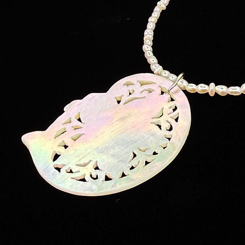 デザインの要となる透し模様は、パールの母貝となる白蝶貝をカットし、小さく開けた穴に糸鋸を通して、手作業で丁寧に加工して行きます。これらは、全て、職人のフリーハンドで行うため、高い技術と経験が必要です。