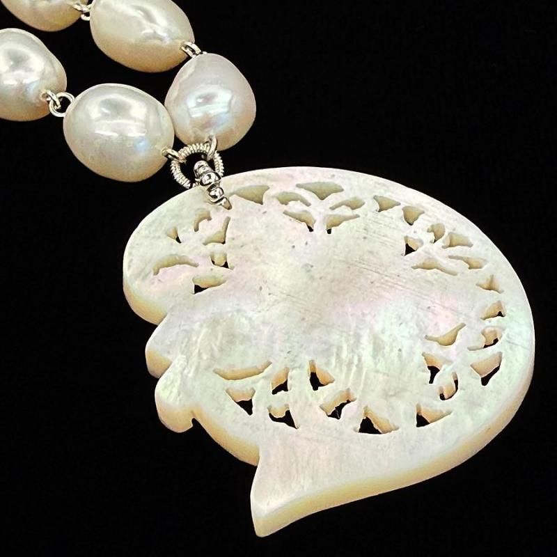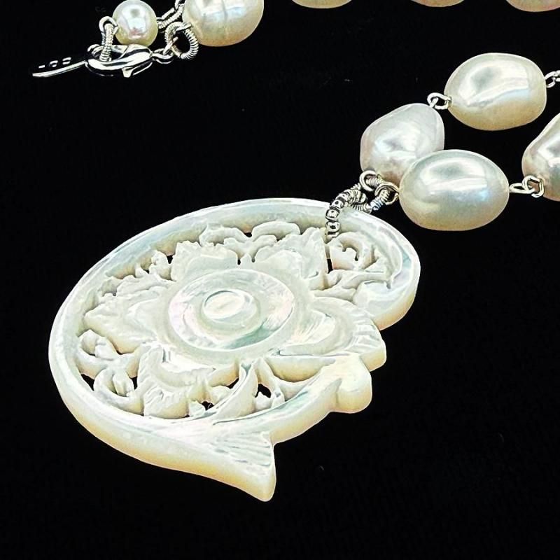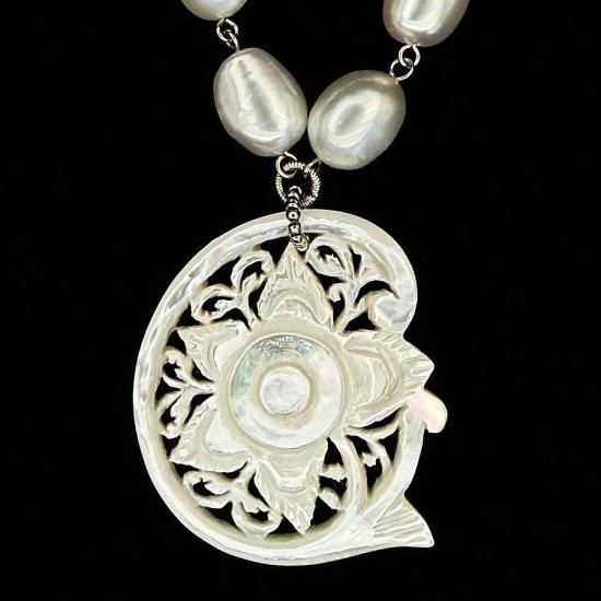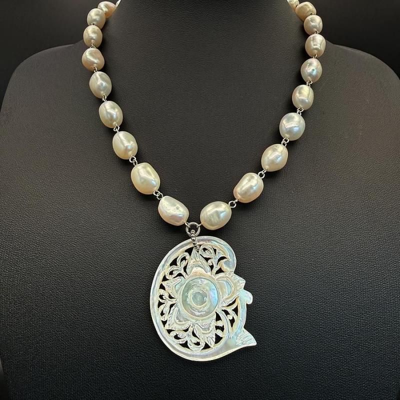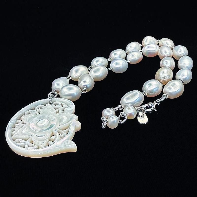 蔦の縁のラインが印象的な花のベツレヘムパールのネックレスです。ネックレス部分は大粒の淡水パールを使用しています。とても存在感のある華やかなネックレスです。バチカン部分にはガラスビーズを使用。