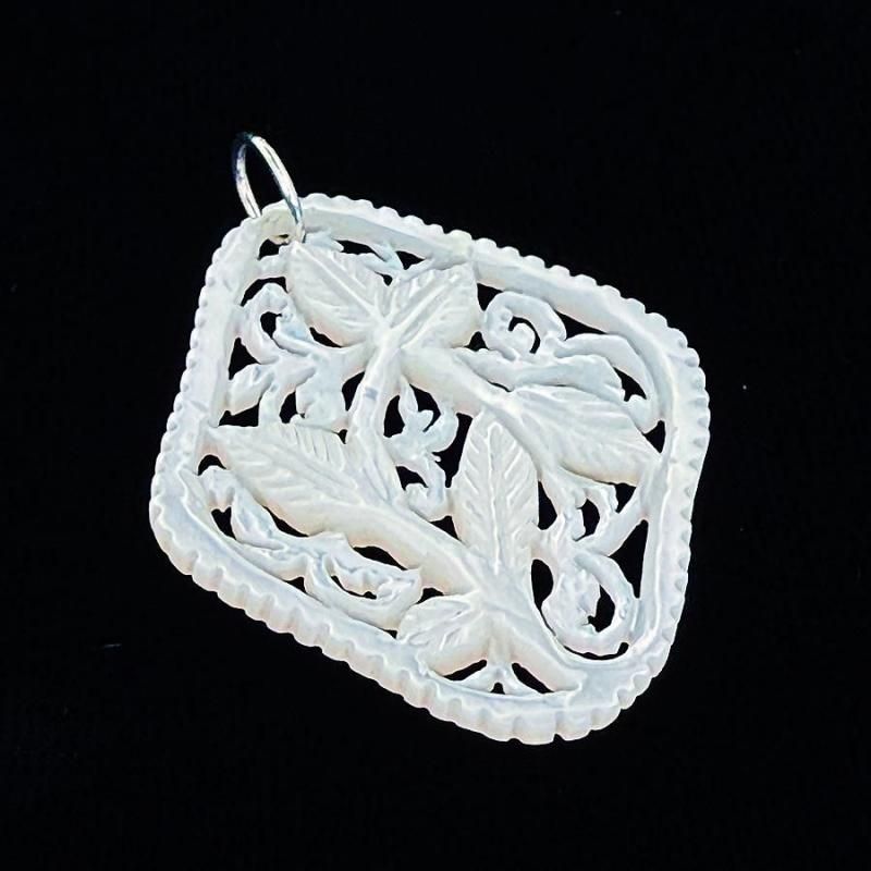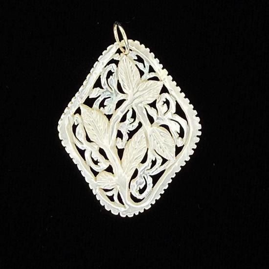 ゆらぎのある菱形の中にオリーブの葉が彫られたベツレヘムパールのブローチです。シルバーのカンはロウ付けされています。ネックレスは別売りですので、ご注意ください。